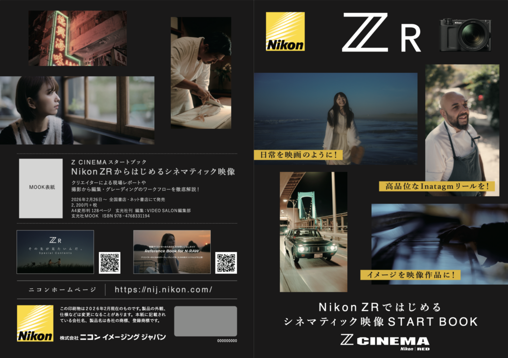 本書では、Nikonの新たなシネマカメラ「ZR」を軸に、映像制作の現場における実践的な活用事例や、RAW収録からグレーディングまでのワークフローが解説されています。
